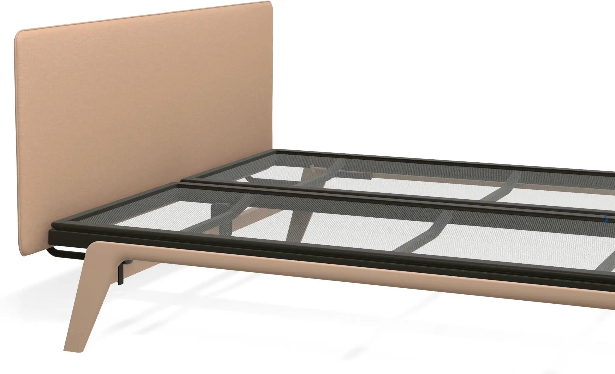 Een stijlvol Auping Original bed met Outline hoofdbord in een zachte blushkleur en een warme stoffering. Voorzien van vlakke spiralen en een hoog frame – een combinatie van comfort en design.