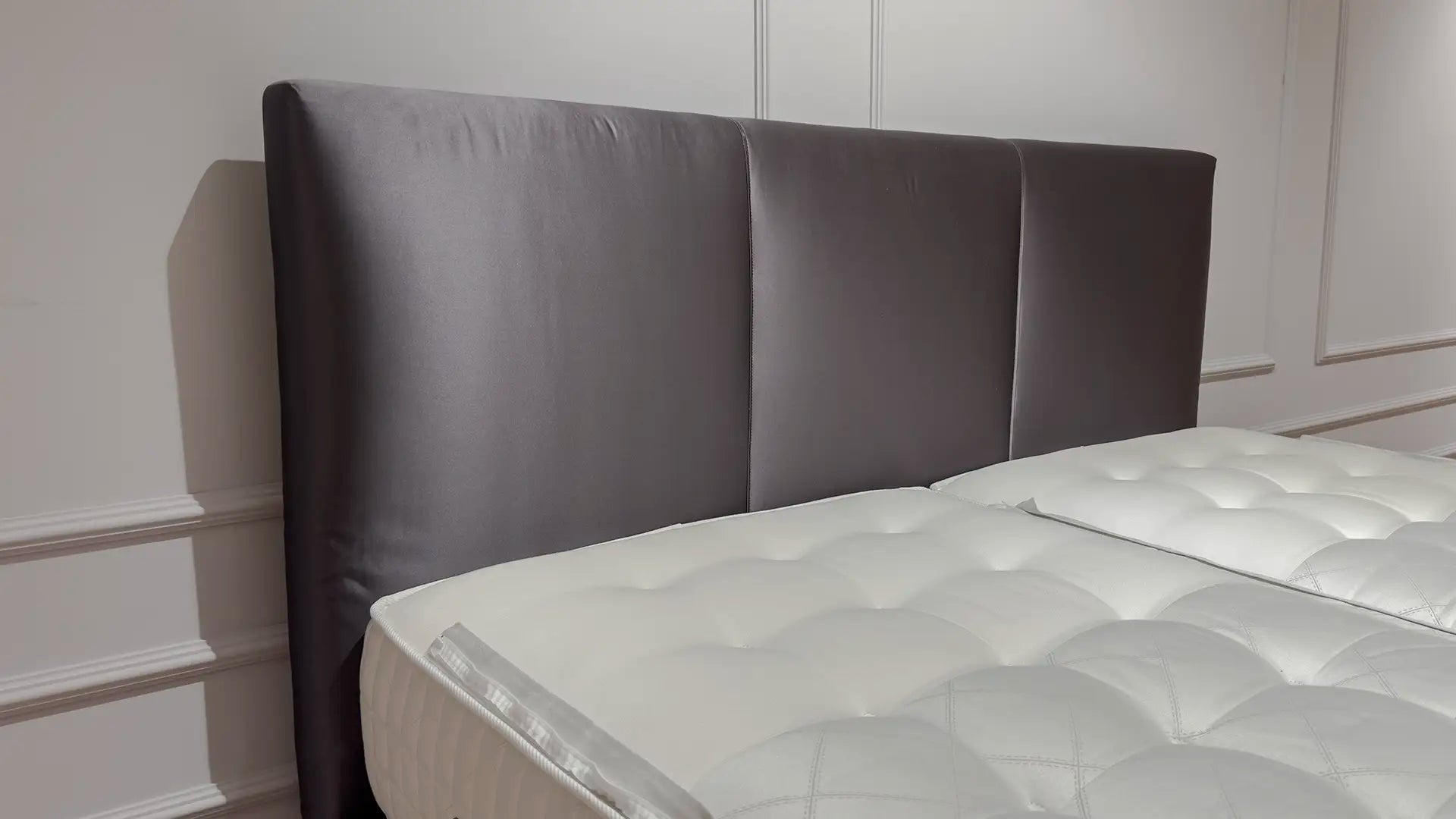 Ervaar Franse elegantie met dit exclusieve showroommodel van Treca Paris: de Kate boxspring in 180 x 210 cm, met Symbiose Prestige matrassen (soft & firm), antracietkleurige Dedar Tabula Rasa satijn bekleding en chromen designpoten. Direct leverbaar tegen een sterk gereduceerde prijs.