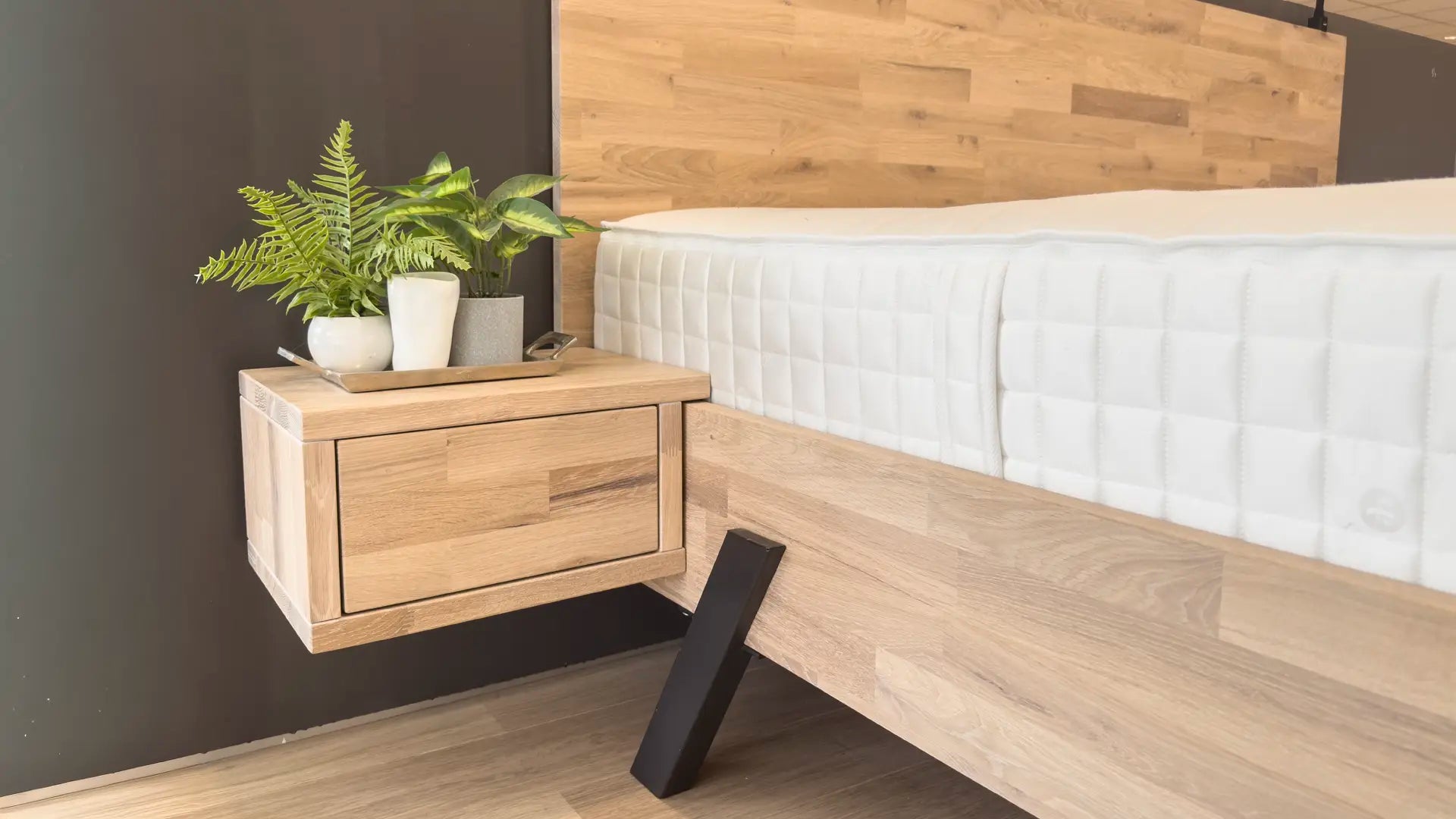 Een modern ledikant met karakter. Het WakeUp Diamant combineert de warme uitstraling van massief eiken met de stoere elegantie van zwart staal. De perfecte balans tussen ambacht en design – ontworpen voor wie houdt van natuurlijke materialen en een minimalistische slaapkamerstijl.